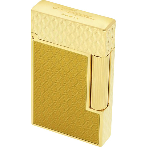 Feuerzeug Linie 2 in glänzender Gelb- und Goldlackierung. Das Feuerzeug ist mit der neuen Drachenschuppen-Guilloche verziert, die sich unter dem Dupont-Lack ausdrückt.