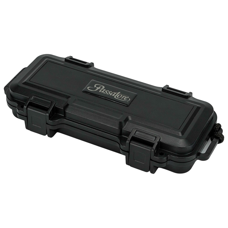 Der eleganten Passatore Cigar Case Reisehumidor in zeitlosem Schwarz, der speziell für die stilvolle Aufbewahrung von 4 bis 5 Zigarren konzipiert wurde. Mit den kompakten Abmessungen von H 4 x B 26 x T 10.7 cm ist dieser Humidor der ideale Begleiter für unterwegs und passt mühelos in jede Tasche oder Reisetasche.